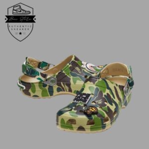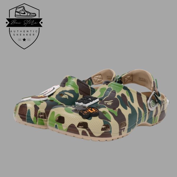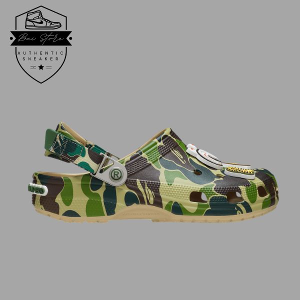 Điểm nhấn của phiên bản này chính là họa tiết Green Camo. Một biểu tượng đặc trưng của BAPE, phủ khắp phần thân dép. Hoa văn camo kết hợp cùng form dáng Crocs Classic Clog tạo nên sự phá cách, vừa tinh tế vừa mang hơi hướng streetwear mạnh mẽ. Chi tiết logo BAPE có thể xuất hiện trên quai hoặc phụ kiện đi kèm, giúp sản phẩm càng thêm nổi bật.